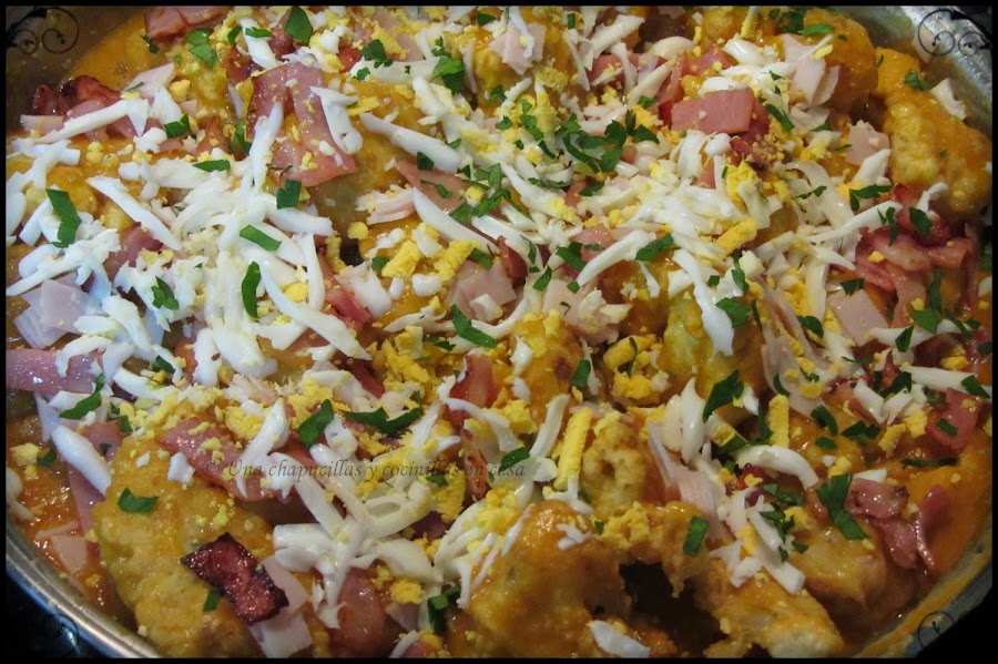 Introducir la coliflor en la cazuela con la salsa, cubrirla bien y ponerle el resto del pavo o jamón cocido, el bacon salteado y ponerle el huevo cocido rallado y espolvorearlo todo con perejil.