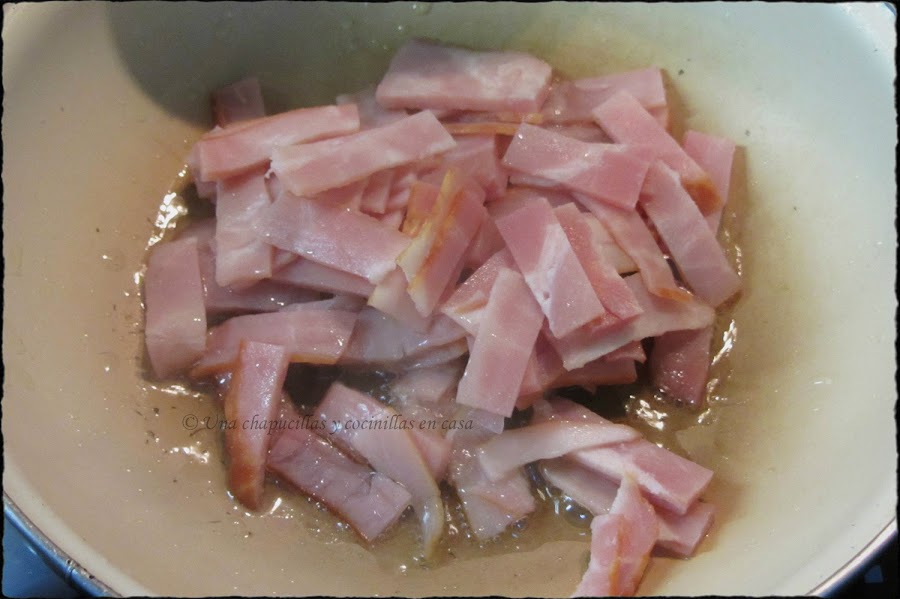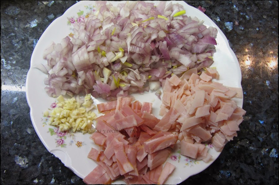 Mientras sigue enfriando un poco la coliflor antes de hacer el rebozado, ir picando el otro diente de ajo, la cebolla, el pavo o jamón cocido y el bacon.