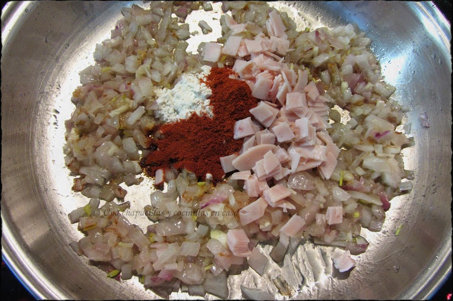 Ahora se prepara la salsa; En una cazuela con un par de cucharadas del aceite que hemos frito la coliflor, saltear la cebolla picada junto con el ajo picado. Cuando empiece a transparentar agregarle la cucharada de harina, el pimentón y la mitad del pavo cortado.