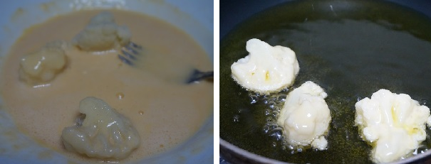 Ponemos una sartén con el aceite a fuego medio. Iremos pasando la coliflor por la masa y cuando el aceite esté caliente iremos friendo la coliflor.