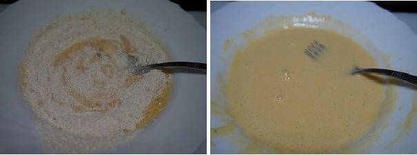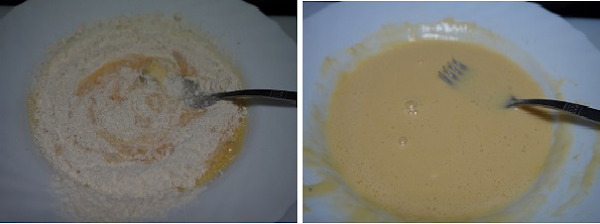 Preparamos la pasta para el rebozado. Batimos los huevos con un poco de sal, añadimos la harina poco a poco hasta que quede como una crema. No ha de quedar muy espesa.