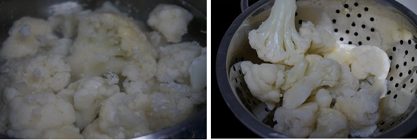 Limpiamos y cortamos la coliflor en ramitos. Ponemos un cazo con abundante agua, cuando empiece a hervir añadimos la coliflor. La tendremos unos 10 minutos, pincharemos si está al dente, la sacamos y escurrimos.