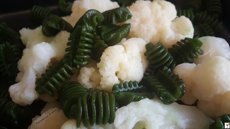 Ponemos dos ollas al fuego con agua hasta la mitad. Cuando rompan a hervir, echamos un puñado de sal en cada una, la coliflor en una y la pasta en la otra. Dejamos cocer unos 8 – 10 minutos, escurrimos y reservamos.