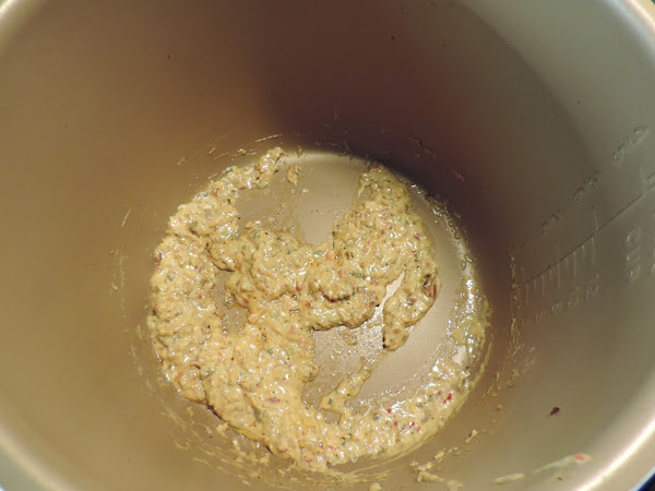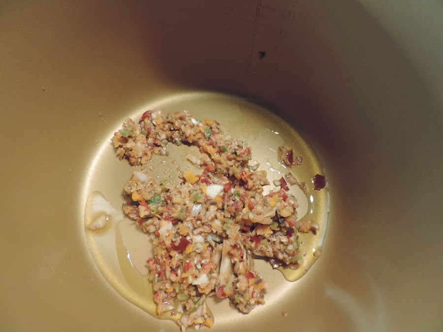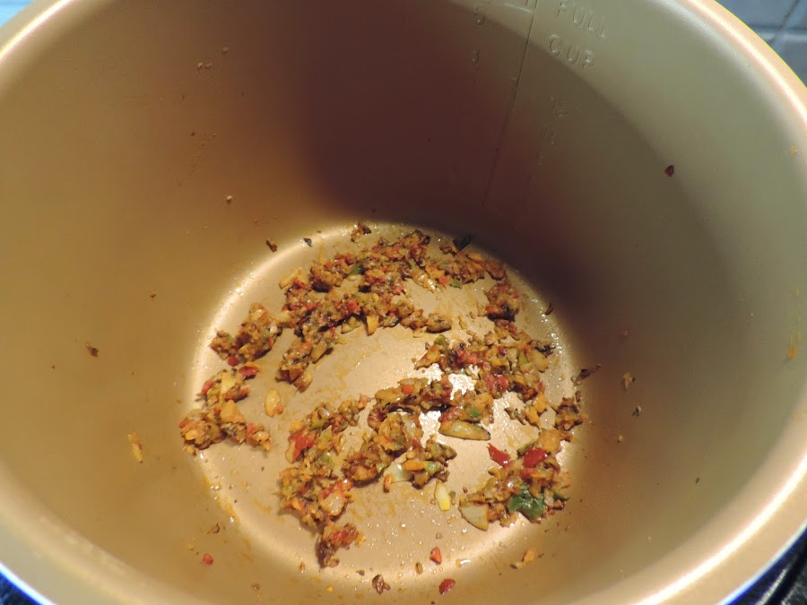 Ponemos 1 cucharada de aceite de oliva en la cubeta de la olla y añadimos la verduras.