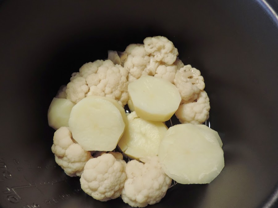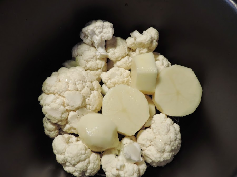 Añadir la coliflor y mezclamos bien con las patatas, aunque se rompa la coliflor no pasa nada.