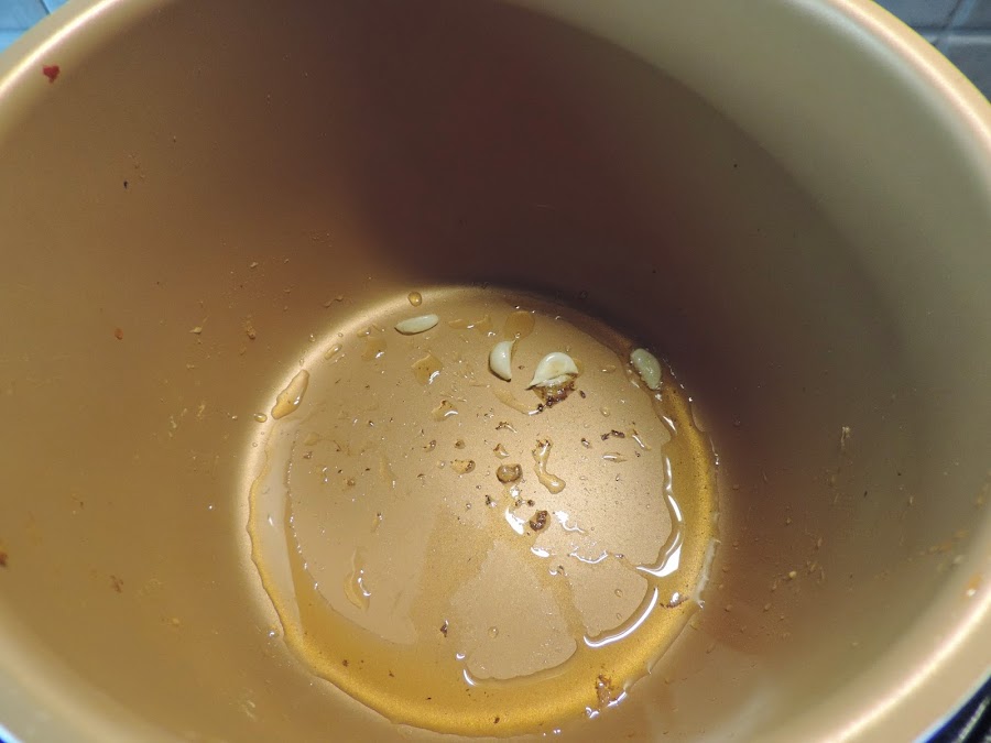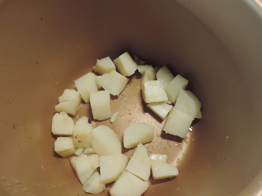Ahora tenemos que dorar un poco la coliflor y la patata, he puesto 1 cucharada de aceite de oliva y 2 dientes de ajo.