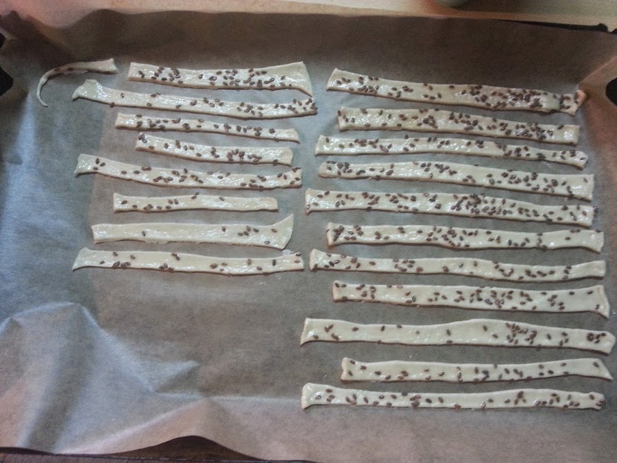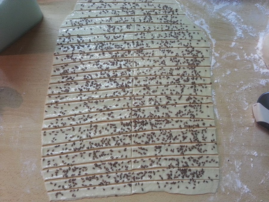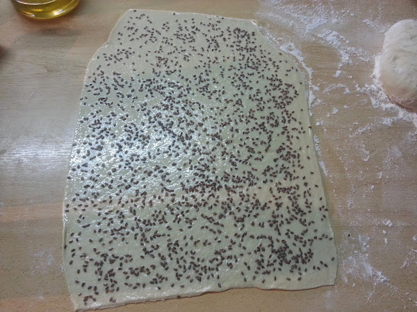 Echamos las semillas de linaza y pasamos muy suave el rodillo por encima para que se peguen mejor las semillas.