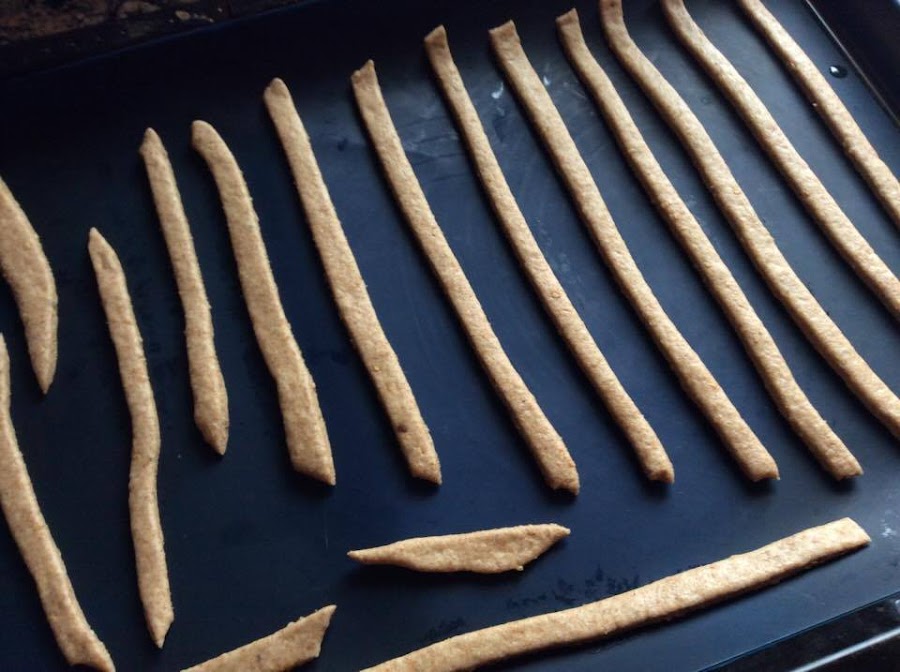 Coloque las tiras de masa en una bandeja de horno con papel antiadherente, separadas para que no se peguen.