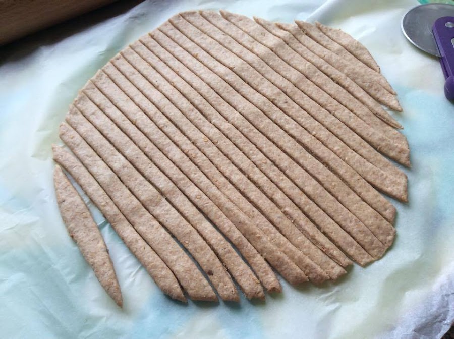 Tome la mitad de la masa y extiéndala sobre un papel de cocina antiadherente. Cuando lo tenga, corte tiras de aproximadamente un centímetro de grosor. Puede ayudarse de un cortapizzas.