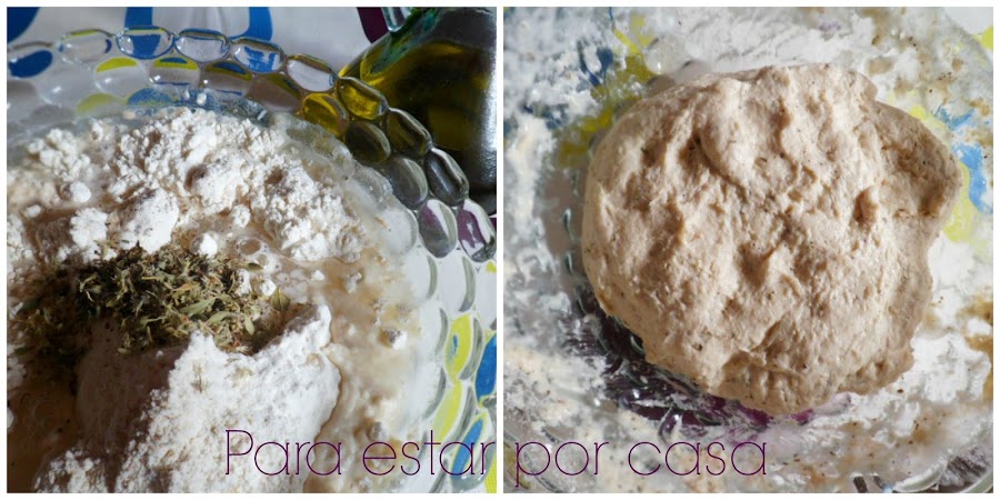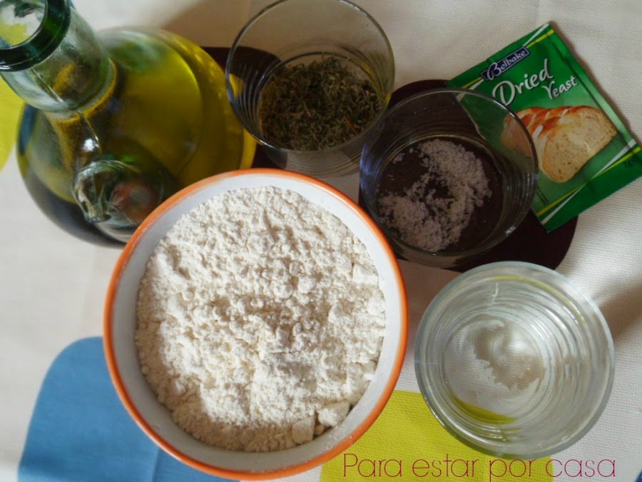 Mezclaremos la harina, la levadura, la cucharadita de sal, el agua y las hierbas y especias que hayamos elegido.