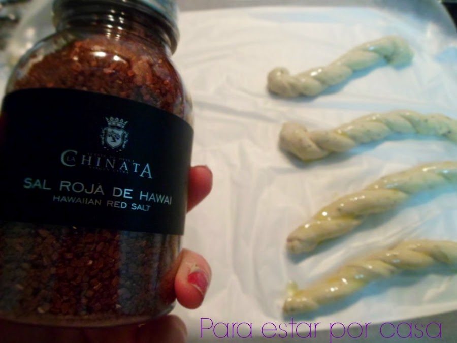 - Opcional: algún tipo de sal especial para la parte superior de los colines. Yo le puse una sal roja de Hawai, pero podéis ponerle Flor de sal. (en poca cantidad, porque la masa ya lleva sal añadida)