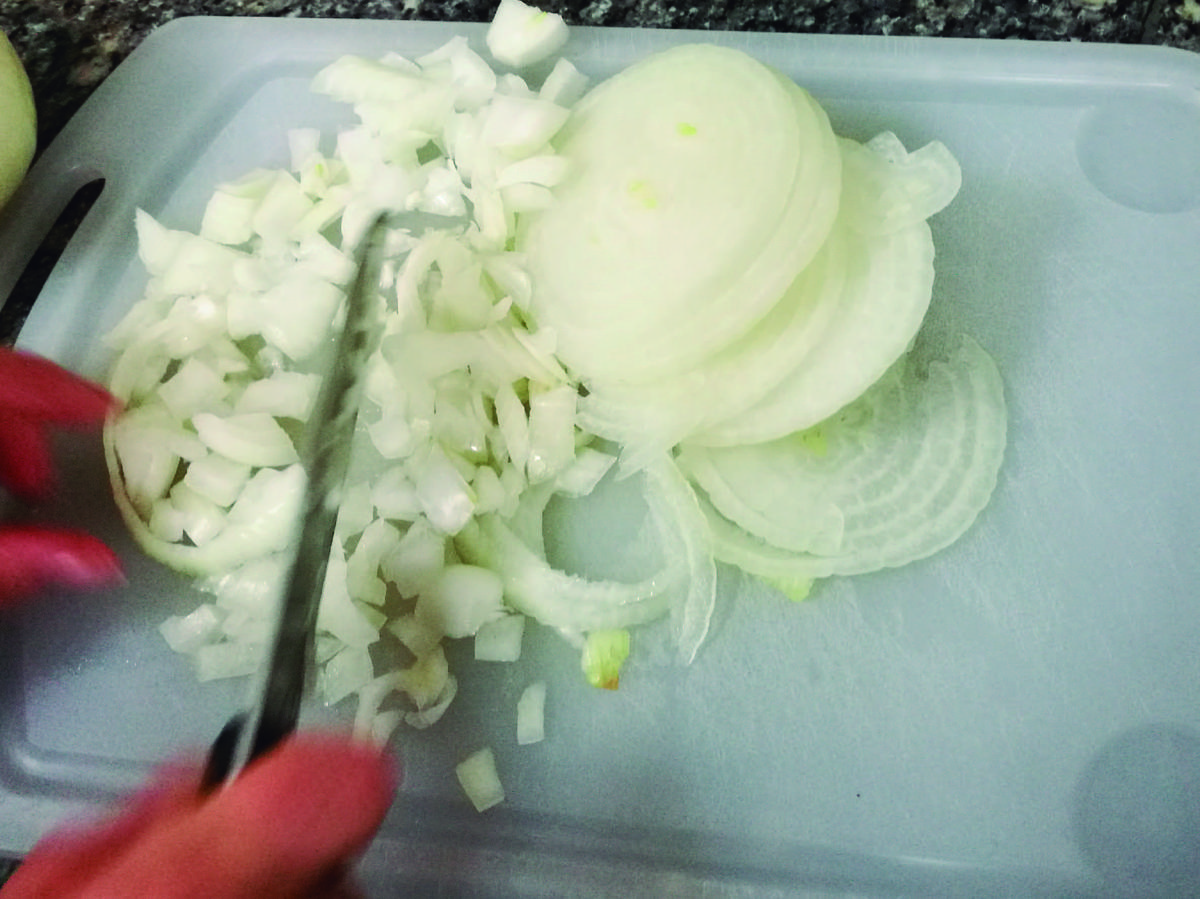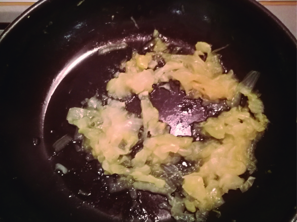 Picamos la cebolla y los ajos y ponemos la sartén al fuego. Yo lo hago sin aceite, es decir, echo la cebolla y le echo sal y bicarbonato sódico. Si las cebollas son dulces irán soltando su propio jugo mientras se van pochando y si no son dulces deberemos de echar un poco de agua según se vaya secando la cebolla en la sartén para que no se pegue, ni se queme.
