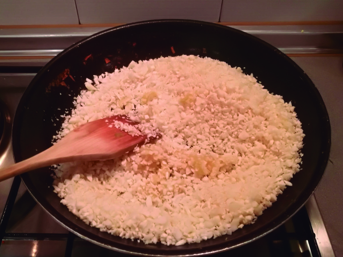 Picamos la coliflor o la rallamos, yo tengo una picadora de mano, por lo que separo la coliflor en flores y las meto en la picadora cierro y tiro de la cuerda tantas veces como haga falta para que quede picadito al gusto. Echamos la coliflor a la sartén y la salteamos un rato con la cebolla y el ajo.