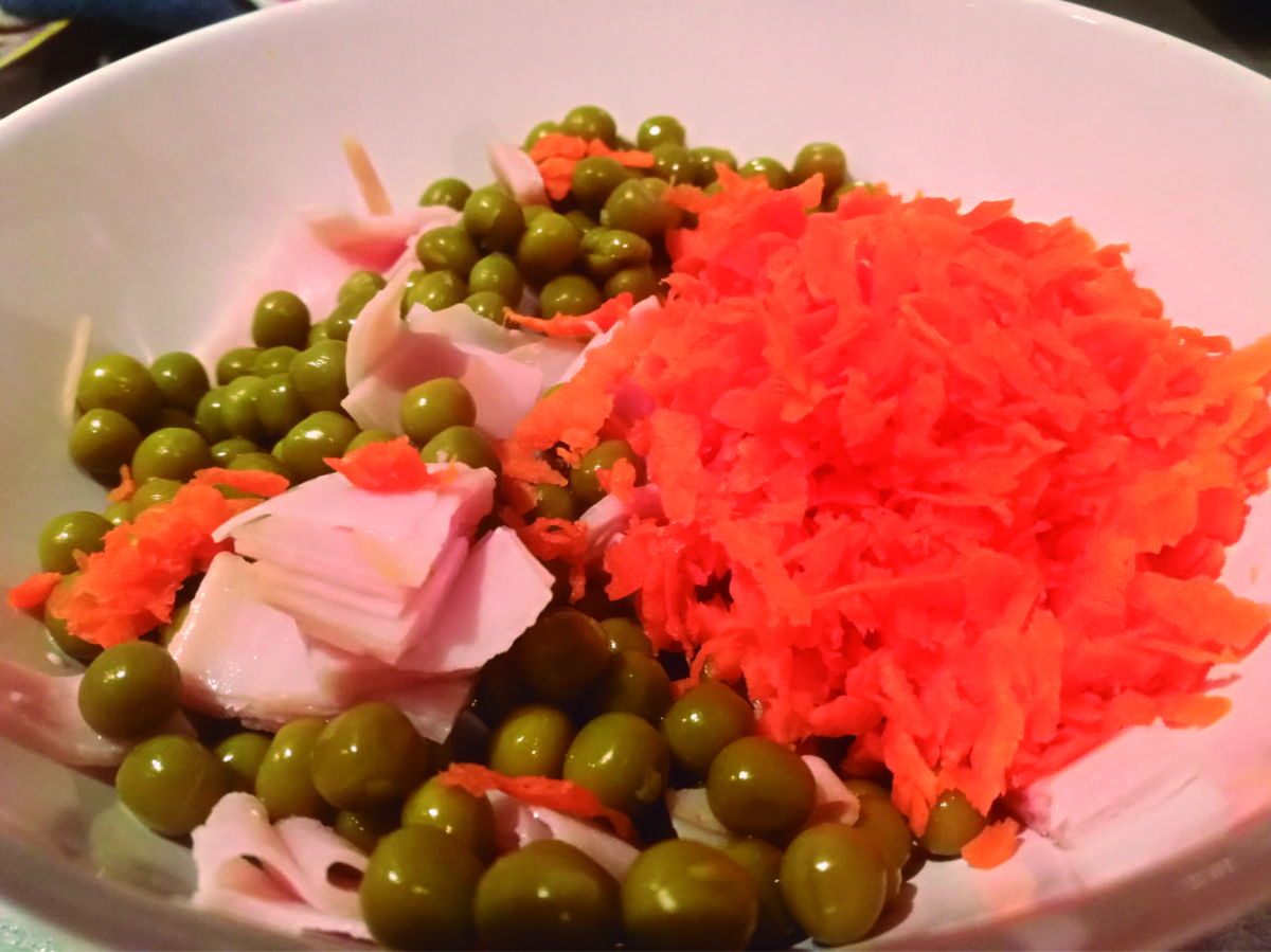 Cogemos un bowl y rayamos la zanahoria o la cortamos en trozos pequeños, escurrimos los guisantes, y cortamos en trocitos el pavo (se puede usar jamón york como ne la original, pero yo soy más fan del pavo).