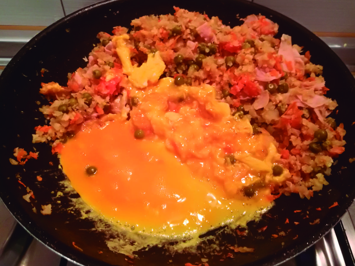 Batimos el huevo para hacer una tortilla como en clásico arroz tres delicias. Ahora tenemos dos opciones, podemos hacer la tortilla en un lado de la sartén donde estamos haciendo el colirroz y así no manchamos más, o podemos hacer la tortilla en otra sartén a parte donde vamos a controlar mejor el acabado de la tortilla, sobre todo para aquellos que les gusta bastante hecha. En mi caso hice la tortilla a un lado de la sartén para no manchar otra y porque no tenemos en casa problemas si la tortilla queda un poco crudita.
