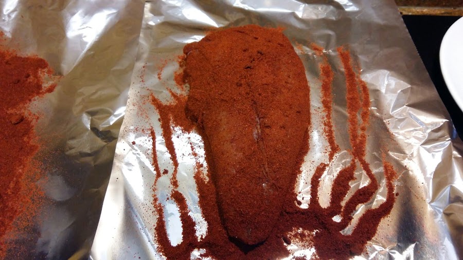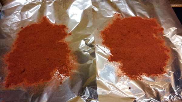 Ponemos 4 trozos de papel de aluminio en la encimera y repartimos el pimentón a partes más o menos iguales.