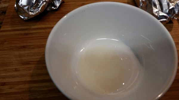 En un cuenco ponemos 1 cucharadita de zumo de naranja y una cucharadita de brandy.