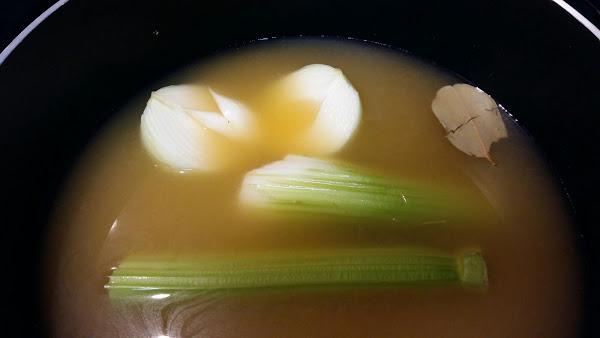 Empezamos poniendo a cocer el caldo de pescado, la cebolla pelada y abierta por la mitad, la ramita de apio, la hoja de laurel y unos granos de pimienta.