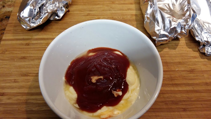 Para la salsa rosa: 3 cucharadas de ketchup, 2 cucharadas de mayonesa light, 1 cucharadita de zumo de naranja, 1 cucharadita de brandy y 1 cucharadita de tabasco.