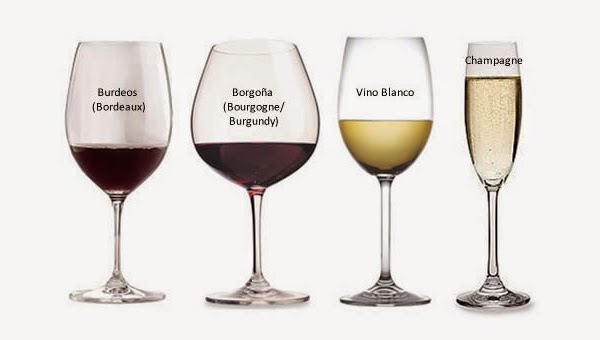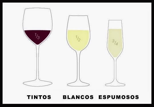 Copa de vino tinto: Copa ancha, de gran cavidad abombada. Antes eran algo más pequeñas que las de agua, aunque ahora se empieza a imponer una gran copa. Solo se llena hasta 3/4 de su capacidad.