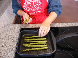 Pon la parrilla con el aceite a calentar. Lava, corta y retira la parte dura de los espárragos. Ponlos en la parrilla y ásalos bien por todos los lados. Salpimenta.