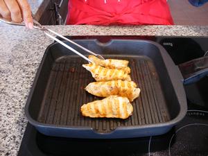 En la misma parrilla, haz los escalopines de pollo dejándolos bien marcados por fuera pero jugosos por dentro.