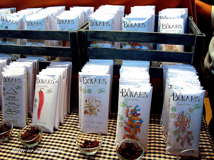 Chocolates Bonaris, elaborados con productos ecológicos y procedentes de pequeños productores. Fijaros en el surtido, hay de todos los sabores imaginables. Con tomillo, jengibre, aceite de oliva, algarrobas... También los podéis encontrar con distintas proporciones de cacao.