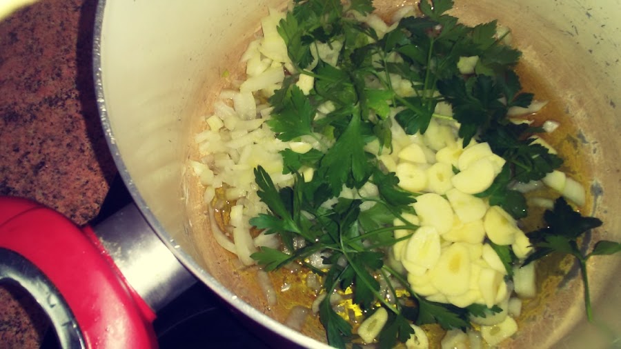 Cortar en brunoise la cebolla, en láminas los dientes de ajo y el ramillete de perejil y dorar en aceite de oliva hasta que tome color marrón oscuro.