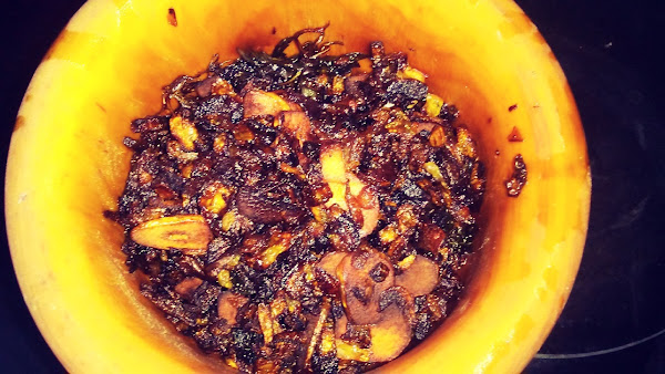Sacamos el sofrito y lo colocamos en el mortero y en el mismo aceite de la cazuela, doramos las alitas sin piel con laurel y doramos.