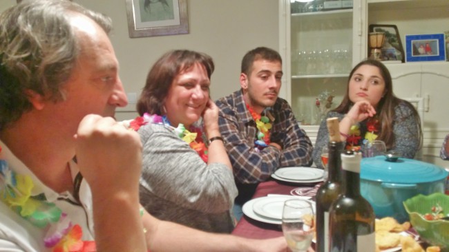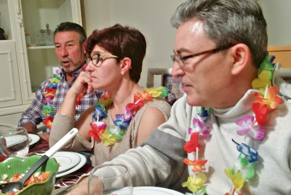 Esta vez la comida temática era evidente. En cuanto entramos a su casa Toni, el marido de Celia, nos encasquetó un collar de flores y nos saludó con un "¡Aloha!". Más claro... ¡agua!. No había ni trampa ni cartón. El tema fue HAWAI.