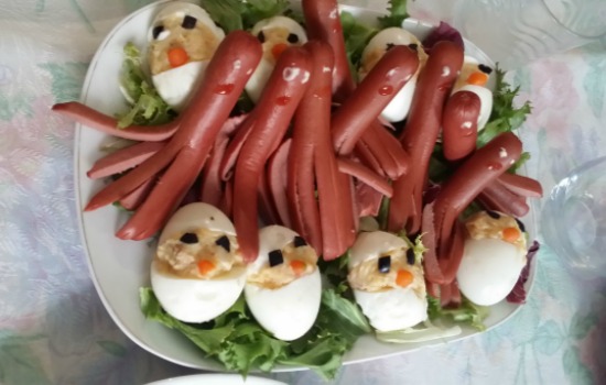 Son pulpitos hechos con frankfurt, con sus ojitos y su boca y pollitos hechos con huevos rellenos de ensaladilla rusa. En este caso el tema eran los pulpos y un ingrediente de la ensaladilla. Te digo los ingredientes: patata, atún, zanahoria, palitos de cangrejo, mayonesa y huevo.