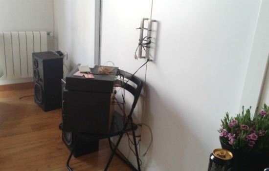 Esto es el apaño que hizo Toni para aislar la zona de los adultos en el comedor con nuestra musiquita de la zona de los niños en la habitación jugando a la Wii. Yes que cuando se ponen a jugar pegan unos berridos que es imposible hablar. Toni ató los picaportes con el cable de la cadena para que se quedase cerrada la puerta.