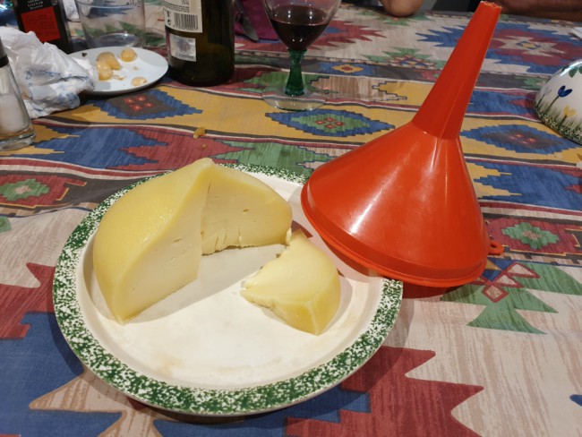 Y, de segundo postre, un queso de tetilla, y Fela nos dejó en bandeja la pista: un embudo. Naturalmente quería representar La crisis de las vacas locas... Divertido... ¿A qué sí?