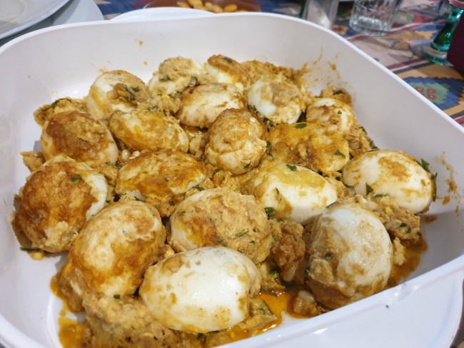 Fela nos hice un plato riquísimo, herencia del recetario de su madre. A mí me encantó: son unos huevos rellenos. Puedes ver la receta AQUÍ, que me la quedo sin ninguna duda... La pista clave era una caja de ibuprofeno.