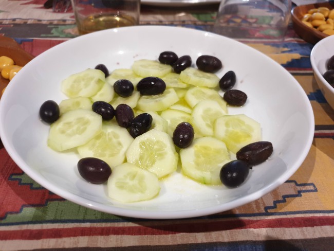 Y empezó la comida con una rica ensaladita hecha con pepino y aceitunas negras. Pista clave: el pepino. Y nos enseñó la foto de unos pepinos. ¿Os acordáis por allá del 2011 de aquellos pepinos andaluces que se mandaron a Alemania y supuestamente causaron un brote por E. coli? Pues aquí están representados.