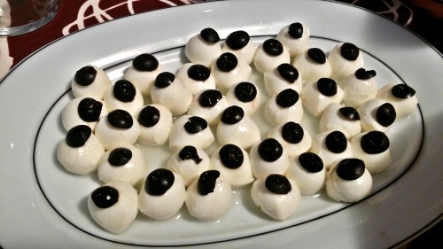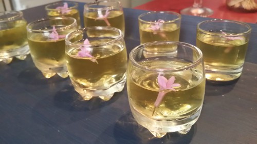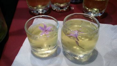 Realmente es un gazpacho al que se le incorpora una flor de ajo. Según nos informó Celia la pista realmente se encontraba en la flor de ajo. Evidentemente se refiere al empleo del ajo como producto que sirve para múltiples usos medicinales. Una compañera de trabajo se toma durante muchos años, antes de desayunar, un ajo crudo acompañado de un zumo de limón natural ¡ahí lo dejo! Otro plato de tapeo fueron unos quesitos con una rodajita de aceituna negra encima.