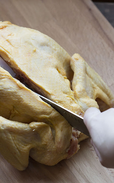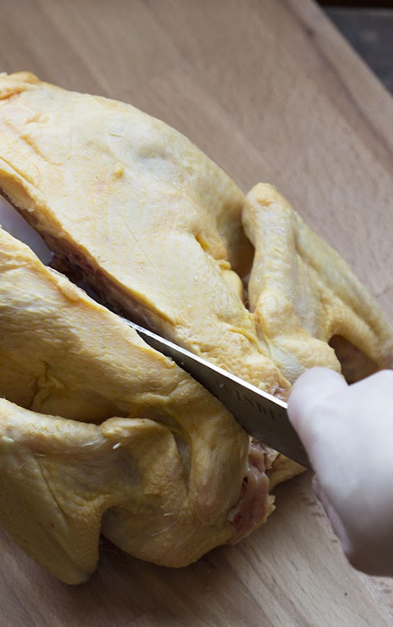 2. Partimos el pollo en dos, comenzando por hacer el corte al lado de la columna vertebral, justo al lado. Terminamos de partir por la parte del esternón.