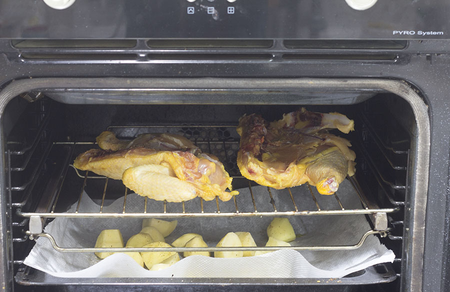 4. Colocamos el pollo sobre la rejilla del horno y colocamos la bandeja debajo con las patatas cortadas en cachelos. Horneamos 30 minutos. Yo primero lo hago con la piel hacia abajo.