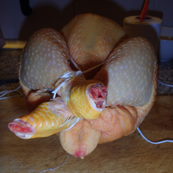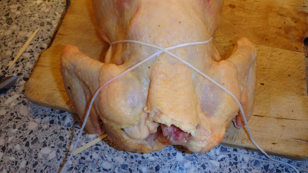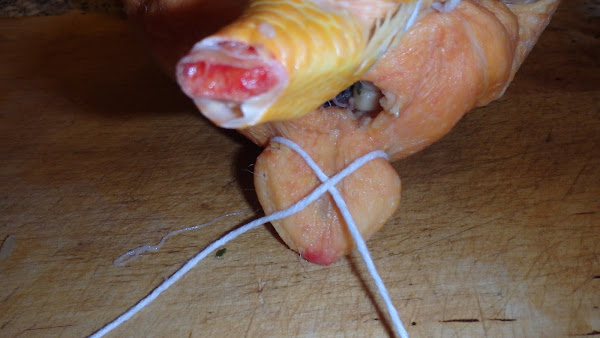 Lo primero que tenemos que hacer es, con las pechugas hacia arriba, atar juntos los extremos de las patas por encima de las pechugas, como en la foto inferior.