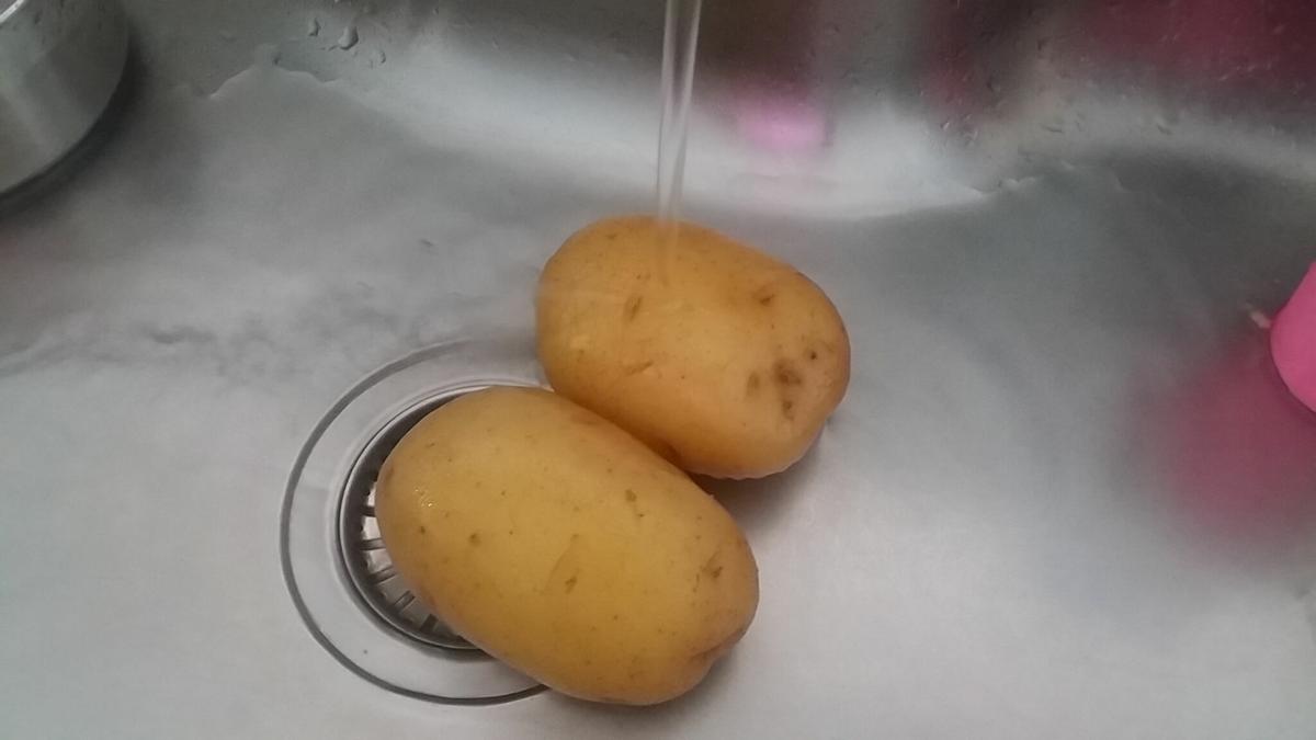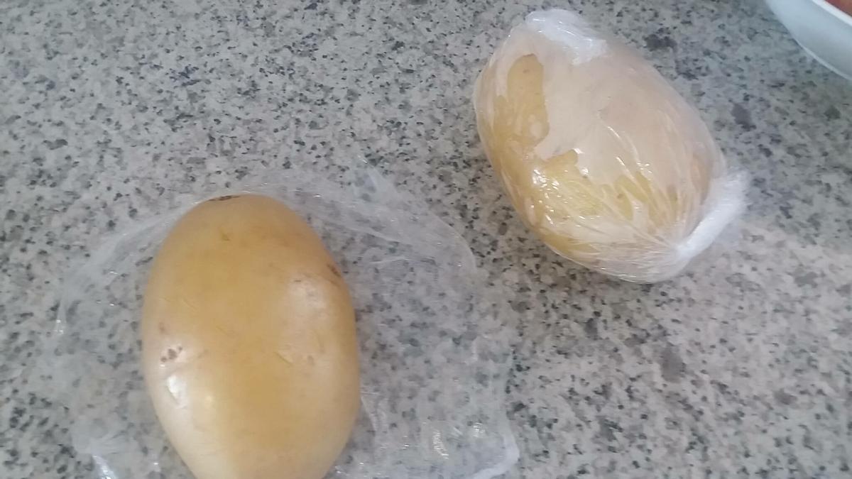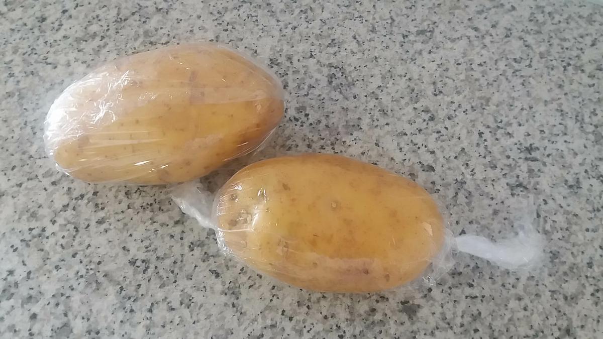 1.- Lava bien las patatas y envuélvelas individualmente en film transparente. Cierra bien ambos lados para que no se escape el vapor (a modo de caramelo)