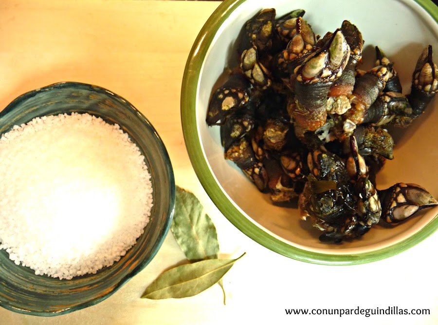 1.- Lo ideal es disponer de agua de mar, pero eso, al menos aquí en Madrid, es complicado, por lo que la sustituiremos por agua con sal y he aquí "la madre del cordero", ¿cuánta sal?, pues la suficiente como para salar el agua al modo marino, pero ya, no todos los mares tienen la misma cantidad de sal, así que yo os propongo utilizar entre 60 y 70 gr. por litro de agua de sal gorda, 60 si los percebesson pequeños, 70 si son gruesos.