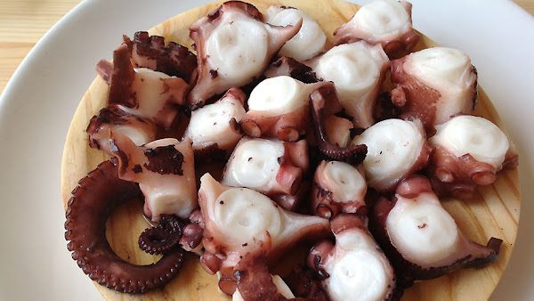 Limpia el pulpo: hay que quitarle la boca que es una especie de “pico de loro” que hay donde se unen los tentáculos. Hay que limpiar bien los tentáculos ventosa a ventosa porque suelen tener suciedad en ellas. Suelen venderlos eviscerados. Si no lo está, tendrás que eviscerarlo. Esto es bastante fácil. Solo hay que darle la vuelta a la “capucha” (cabeza) y retirar todo lo que encuentres en su interior. Los ojos se le dejan al cocerlo pero se retiran después de la cocción.