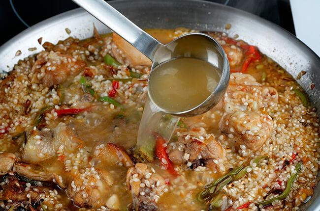4.- Ten en cuenta la cantidad de caldo: La cantidad necesaria de caldo que vas a necesitar va en función de si vas a realizar arroz seco o caldoso. Pero sabemos que hay muchos factores en la cocina que pueden variar los resultados, como la temperatura o los ingredientes, así que es recomendable vigilar la cocción para ajustar pequeñas correcciones de caldo o agua si hiciera falta. Te recomiendo veas este tip para orientarte mejor. Clica aquí