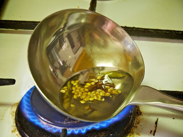 Después dejaba que todo diera un hervor final. Los indios hacen los mismo con sus especias. Cuando el curry está casi terminado sofríen aparte unos dados de chalota, granos de mostaza, comino en grano y algún chile.