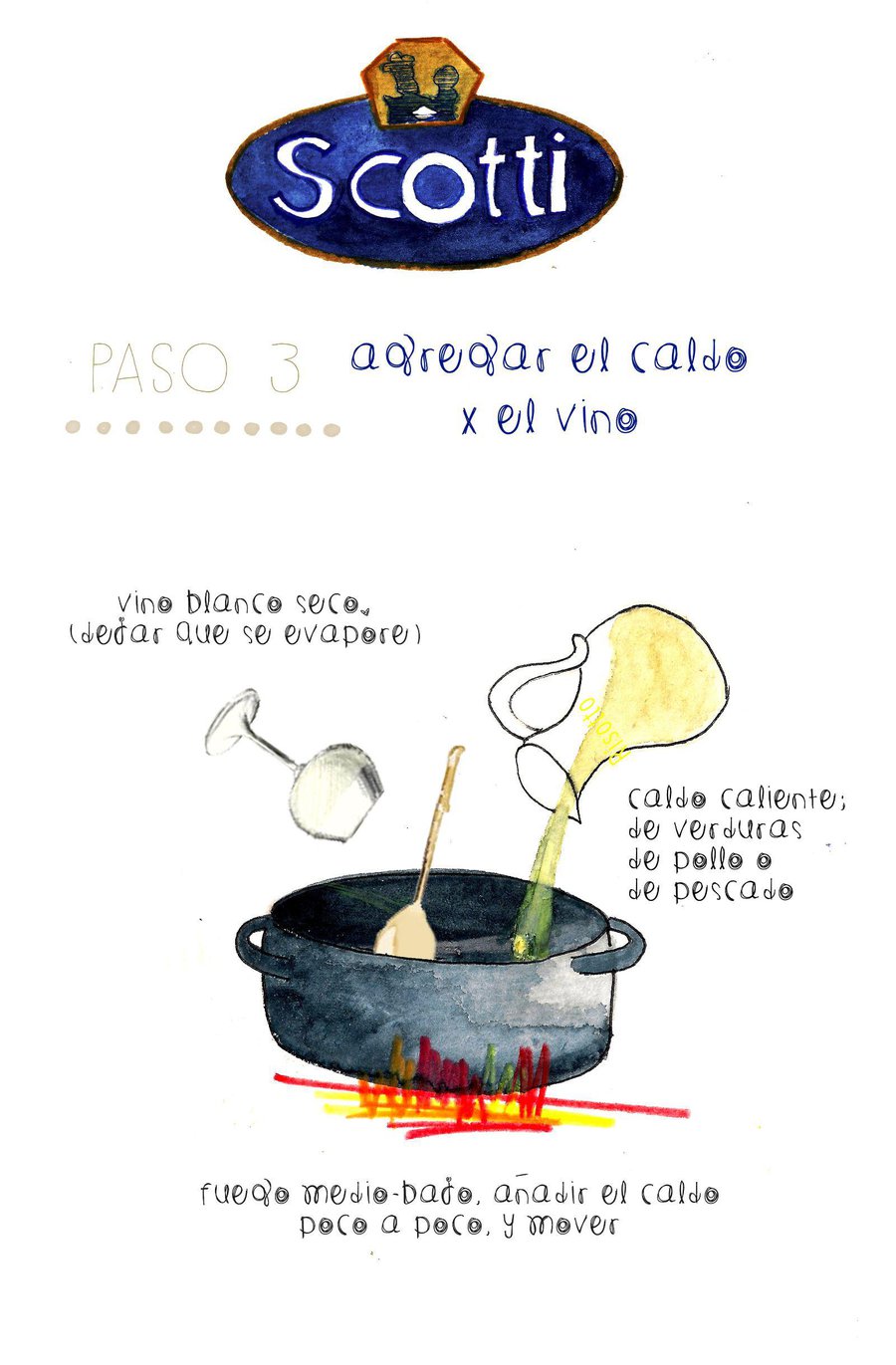 La forma en que se añade el caldo para la cocción del arroz y los ingredientes que lo acompañan es una de las claves para que esta receta de arroz sea tan diferente a otras: el caldo no se añade en su totalidad desde el principio, sino que durante los 15-18 minutos que dura la cocción del arroz arborio se va agregando poco a poco, removiendo para que se absorba lentamente y volviendo a verter más hasta completar todo el caldo necesario.Hay varias cuestiones importantes a tener el cuenta en esta acción: