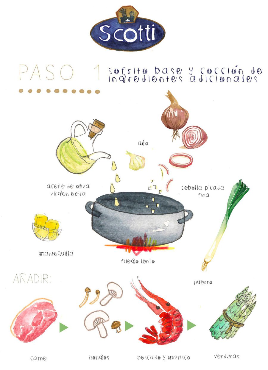 La base de este plato de arroz requiere de un sencillo sofrito que se elabora dorando en un poco de aceite de oliva virgen extra o mantequilla, y a fuego lento, cebolla, chalota, ajo o puerro, aunque la cebolla es la elección preferida por los italianos.Una vez que la cebolla (o el ingrediente seleccionado) esté transparente, es el momento de agregar a la olla los ingredientes seleccionados para acompañar al arroz, y que pueden ser desde carne o pescado, pasando por mariscos, verduras y hortalizas o, el que más me gusta a mí, setas. ¡Existen muchas alternativas! Se cocinan el tiempo que el ingrediente escogido necesite y teniendo en cuenta, además, que luego se someterán a una cocción junto al arroz de unos 15 minutos.