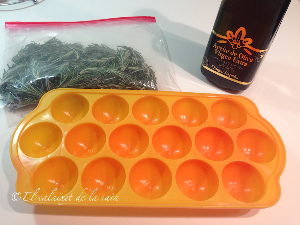 Soy muy fanática del romero y el tomillo en la cocina y me encanta tener macetas con plantas aromáticas frescas pero en el pueblo es tarea imposible, pues la bajas temperaturas hacen se se hielen irremediablemente, por lo que he de acabar usando plantas secas...y no me gusta, es por éso que he dado mil vueltas buscando soluciones para poder disponer siempre de hierbas frescas, ya que sobretodo para la paella, el romero me resulta imprescindible así que tras mucho buscar, he dado con la solución perfecta y es congelarlas.