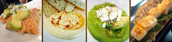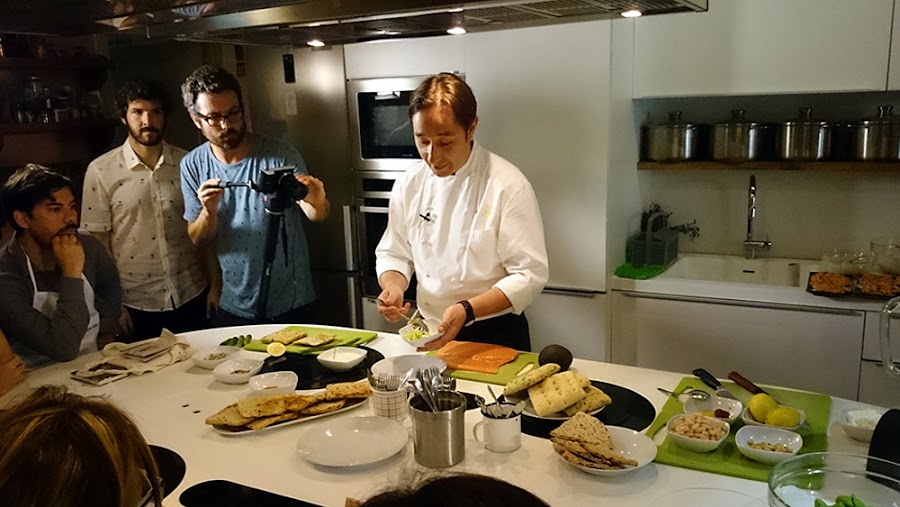 Luego comenzó el show cooking propiamente dicho, preparando cuatro platos más que interesantes: Focaccia de salmón ahumado con Tzatziki, Hummus de alubias blancas y cacahuetes con pan polar, Hummus de guisantes con aguacate y queso Feta también con pan polar y por último Bocata de Potón del Atlántico sobre espinacas salteadas. Sobra decir que todo estaba buenísimo y las combinaciones más arriesgadas son las que más nos gustaron a todos.