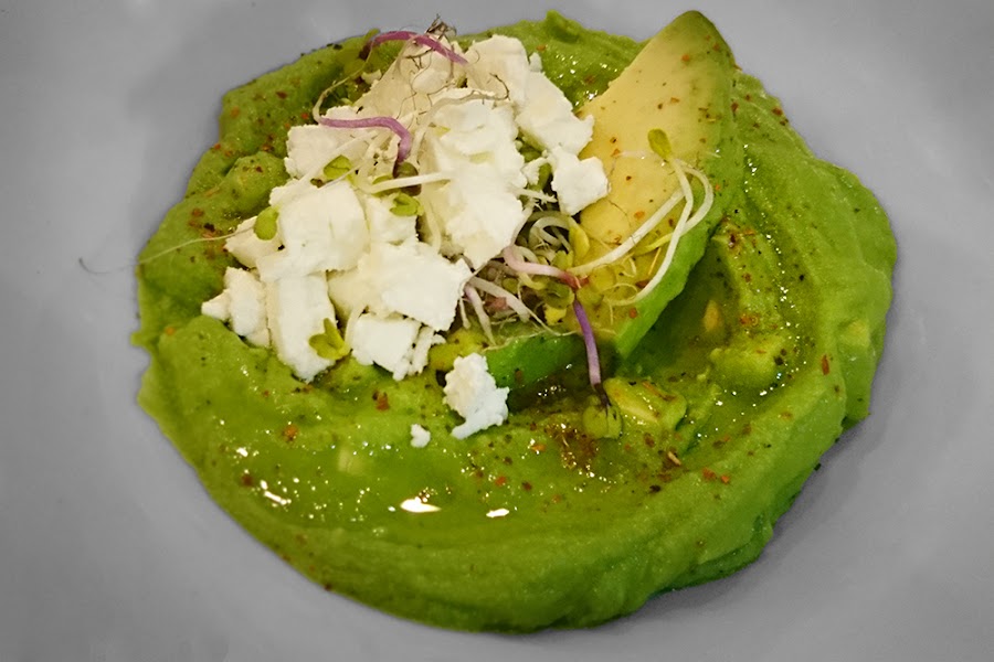 HUMMUS DE GUISANTES Y AGUACATE CON QUESO FETA Y PAN POLAR:
