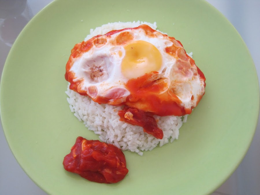 Es muy cómodo para hacerlo con arroz a la cubana porque fries los huevos en el tomate y luego ya echas todo el contenido de la sartén encima del arroz, quedándote el arroz con la salsa de tomate y el huevo frito.
